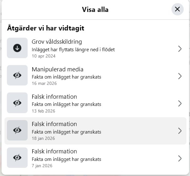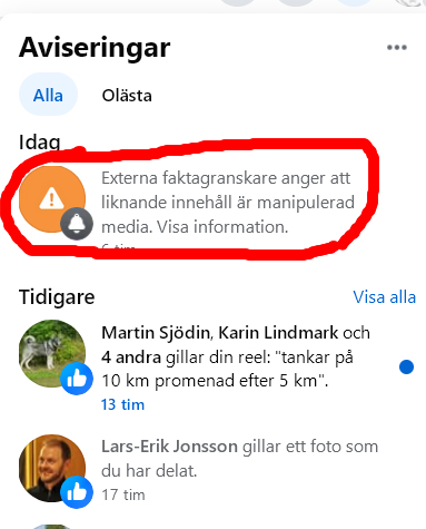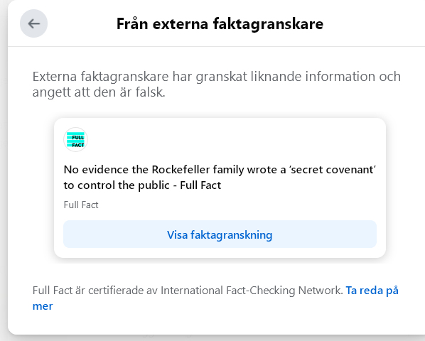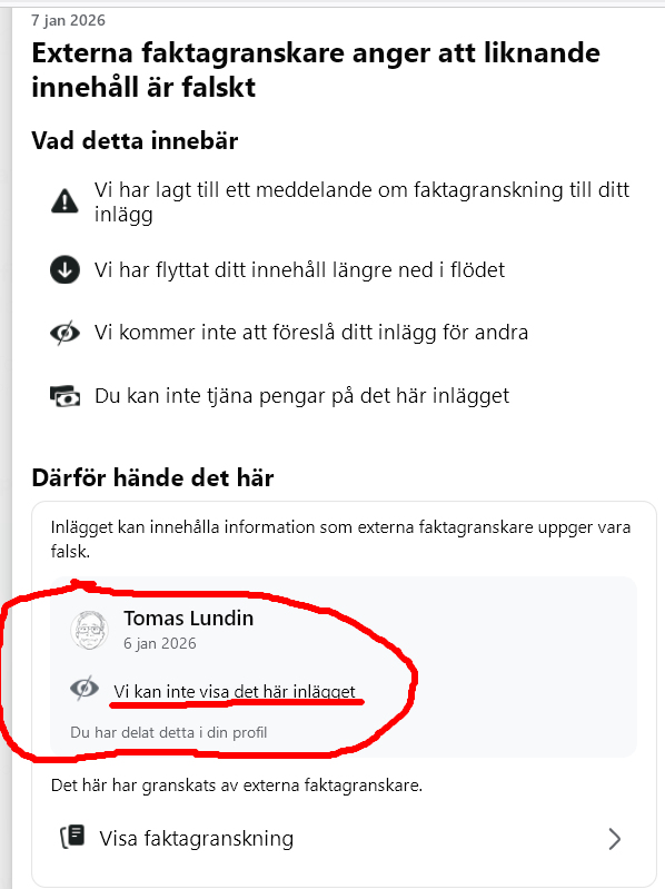Den tredje ”synden” jag ansetts ska ha begått är tydligen inte att det innehåller information som ”externa faktagranskare” uppger vara falsk, utan att inlägget KAN innehålla information som ”externa faktagranskare” uppger vara falsk. Vilket jag då språkmässigt tolkarsom att den inte alls behöver vara falsk ?: