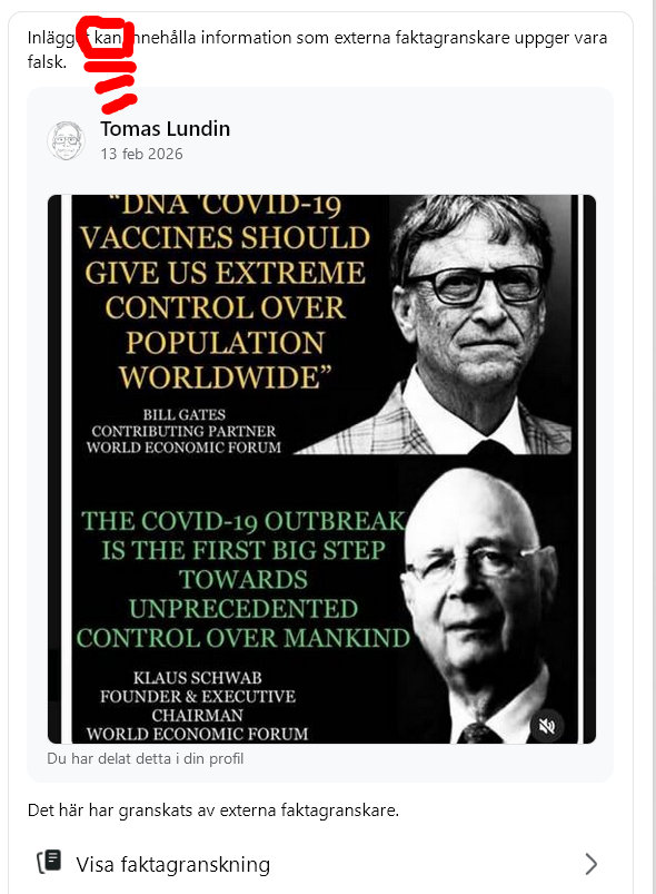 Det har kommit till min kännedom att jag är en farlig man som sprider information. Farlig för vem? och på vilket vis? Låt oss se hur det nu är med detta. Min tes är att syftet är att skrämma folk till tystnad, i det här fallet skrämma mig till tystnad. Och allt detta så kallade ”faktagranskande” från ”oberoende” eller ”externa” ”faktagranskare” görs med hjälp av algoritmer, och per automatik. Tanken är att när dessa hot om att hamna i facebook-finkan kommer, så ska man som tvivlare och tillika riddare av yttrandefrihetsordern, dra åt sig öronen och sluta dela liknande inlägg, sluta ifrågasätta makten, och inte ens läsa igenom ”faktagranskningen” – Jag, läste igenom faktagranskningarna, 5 st, och adderar några gamla ”externa faktagranskningar” till texten.