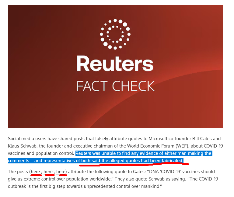 Så denna ”faktagranskning” baserades alltså på att Reuters, som utför ”faktagranskningen” inte FÖRMÅDDE hitta något bevis för att Bill Gates och Pfizers VD, skulle sagt så? Det påståendet fråmn Reuters sida, lämnar ju även möjligheten att det beror på bristande förmåga att gräva fram uppgifter, … eller bristande vilja? – Och vem/vilka äger Reuter? blir nästa fråga. Och skulle vi ändå vara osäkra så bedyrar dessa så kallade människor, mångmiljardärer SJÄLVA att det inte är sant som skrivits i den delade artikeln. :O