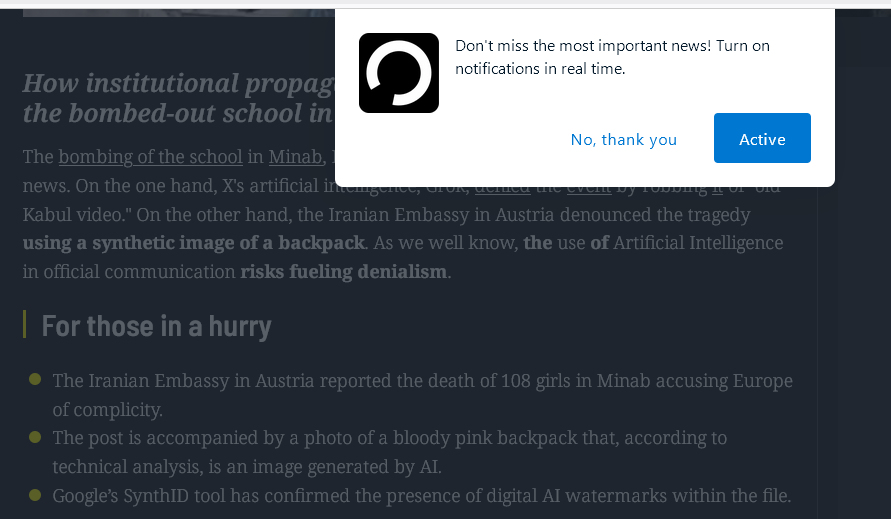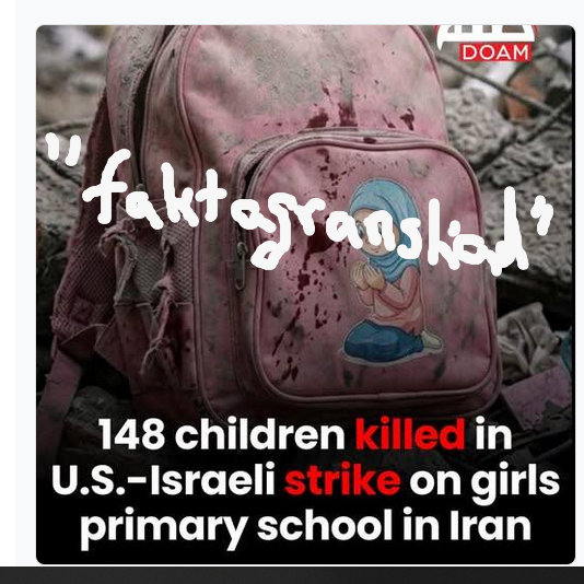 I det här fallet bestrider inte ens de ”externa faktagranskarna” ATT det bombats och mördats 148 Iranska flickor (möjligen ifrågasätter de antalet döda, eftersom den siffran kommer från landet som drabbats)… från USAs och Israels sida, utan man attackerar det hela som så klart är obekväm information för de som står på mördarnas sida, genom att en bild på en rosa blodig skolväska, har ”identifierats” som en bild som modifierats genom AI genom ”teknisk analys” … analys gjord av Google, som i sin tur ägs av de krafter som arbetar för EN global regering, i vilken de själva förväntas sitta i.